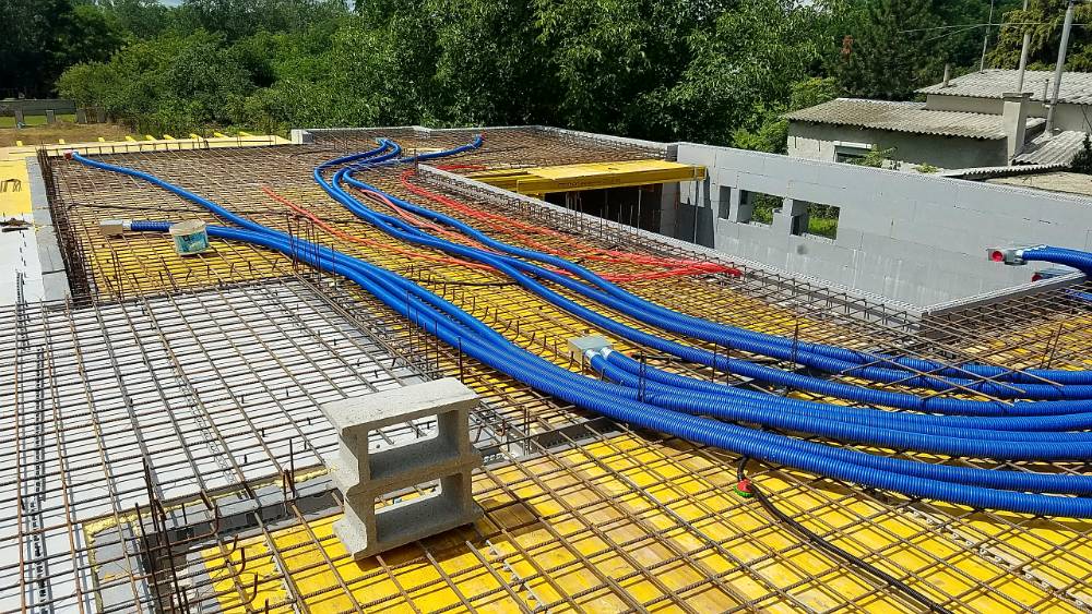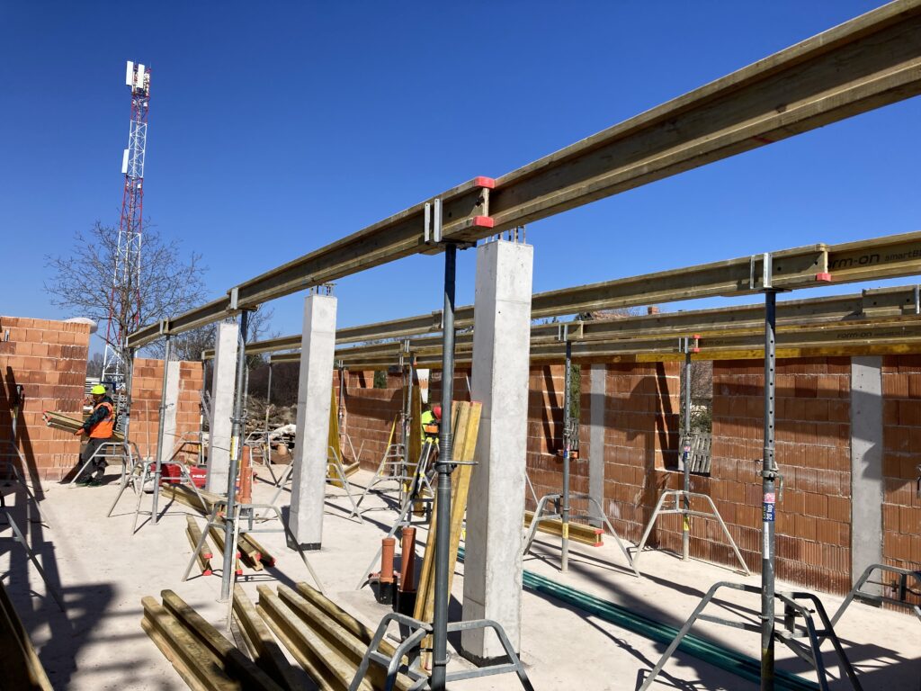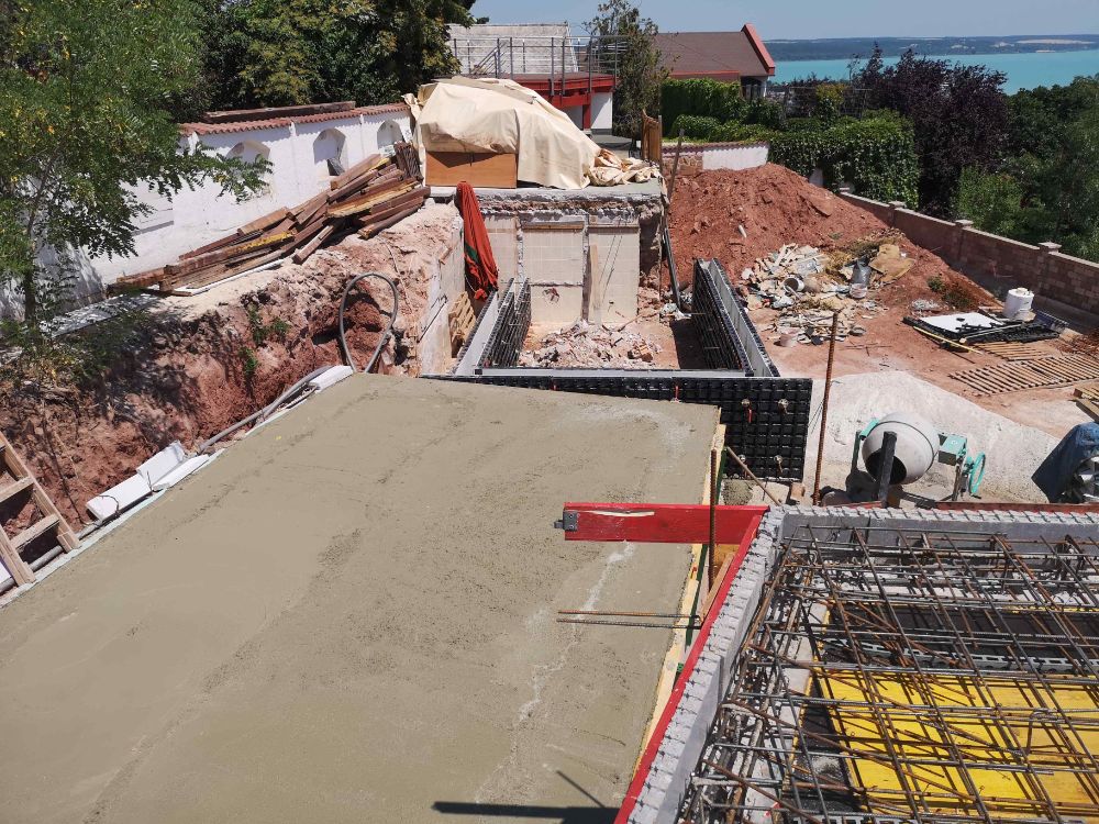 Alapozás, Vasszerelés, Pillér zsaluzás, falazás ProKoncept elemekkel, monolit födémszerkezet zsaluzása fathartós rendszerrel.